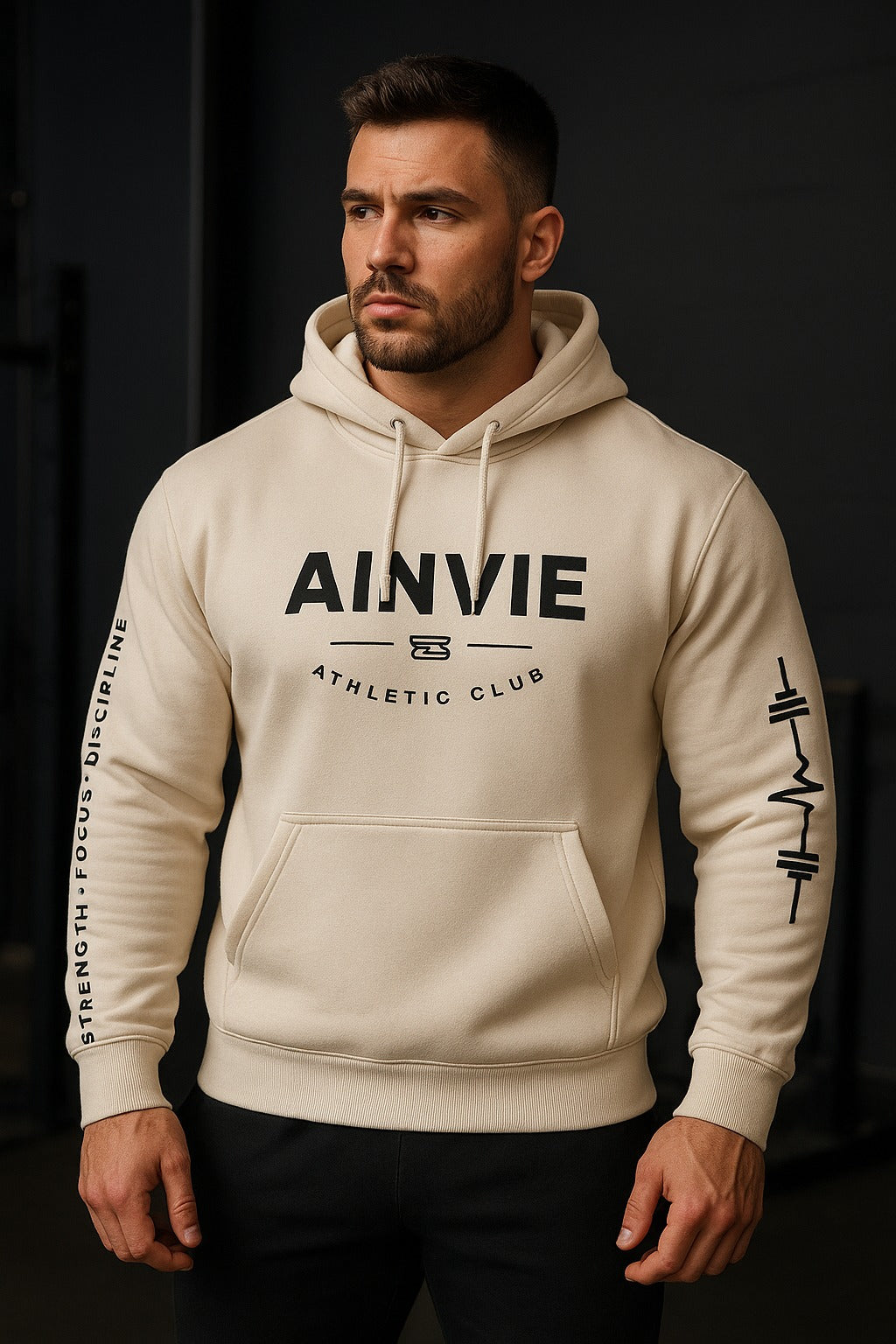 Bold black typography on the chest and sleeves builds a strong identity, featuring AINVIE’s signature Athletic Club emblem and empowering sleeve text. A barbell-pulse graphic on the right arm adds a motivational edge, making this hoodie more than apparel — it’s a mindset.